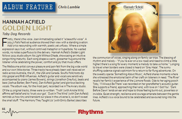 “Hannah Acfield is a stunning vocalist and I absolutely loved having her perform at my venue. Hannah’s songwriting and arrangements on her debut album blew me away when I first heard them. Such a maturity and musicality that is very rare to hear and I’ve had it on repeat ever since! A rising star, Hannah’s live performance is made even more endearing as she is just the loveliest person with some very entertaining down to earth stories and banter. My hope for Hannah is that her new record is embraced by radio stations and Festival programmers worldwide and her music reaches the ears of audiences across the world, as she is a great representation of Australian talent, and I believe she has the potential to reach great heights as both a performer and a songwriter.”